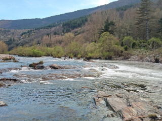Im Vergleich zu den anderen Abschnitten existieren hier einige längere Zahmwasserabschnitte. Gelegentliche Schwälle bieten aber auch hier etwas Abwechslung. Während der Paddeltour wird u.a. an einem einsamen Dorf auf der Linken und an einem Schloss (Luxushotel u. Restaurant; s. übernächstes Bild) auf der Rechten vorbeigepaddelt. |