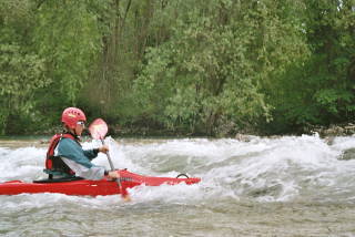 Der Fluss zeichnet sich hier im Wesentlichen durch längere Fließstrecken und vereinzelten leichten Kiesbankschwällen und Kurvenschwällen (s. Bild oben) aus. Das durchschnittliche Gefälle dieses Abschnittes beträgt lediglich 3 ‰. Die Schwierigkeiten liegen bei WW I-II, wobei der IIer-Grad nach der Klamm nur noch an ca. 3 Stellen erreicht wird. Bei diesen IIer-Stellen handelt es sich u.a. auch um einen etwas kräftigeren Schwall mit einigen schönen hohen Wellen (s. Bild unten). |