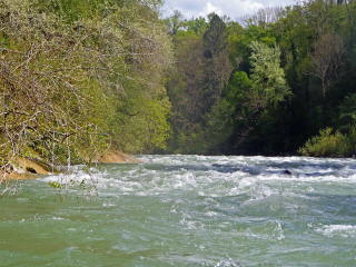 Bei mittleren Wasserständen liegen hier die Schwierigkeiten bei WW III+. Bei Nutzung von 2, 3 oder auch 4 Kehrwassern kann man aber alles rechtzeitig erkennen und den wuchtigsten Stellen zumindest etwas ausweichen. Notfalls kann man die Passage auch etwas mühsam über das linke Ufer umtragen, vorausgesetzt, dass man rechtzeitig ein Kehrwasser anfährt. Bei höheren Wasserständen bieten Chicken Lines sogar alternative Routen. Hiernach lassen die Schwierigkeiten deutlich nach und liegen auf den nächsten Kilometern bei WW I-II und WW II. In größeren Abständen folgen aber auch einige wenige III-´er-Stellen, deren Anzahl in der 2. Hälfte etwas zunehmen. Bis zum Fahrtende ist nun alles von Weitem schon rechtzeitig erkennbar. Fast allen Stellen kann man, wenn man möchte, bei der Flussbreite ausweichen. In den Außenkurven sollte ein wenig auf Prallwände und mögliche Unterspülungen achtgegeben werden. Die Fier fließt zunächst in großen Kurven mit einigen Schwällen durch eine schöne Waldschlucht (s. Bild unten; hier bei 18 cbm/sec, d.h. Mittelwasser). |