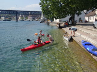 In Stein am Rhein am besten auf einen der Parkplätze 300 m nordwestlich der Altstadt parken (> N 47° 39' 45'', E 08° 51' 15''). Hier sind Parkgebühren für bis zu 4 oder 6 Stunden zu entrichten. Von hier brauchen die Boote nur wenige Meter bis zum rechten Flussufer getragen werden. Der zumeist ca. 150 m breite Fluss bietet teilweise gute, teilweise fast nicht spürbare Strömung und zumeist herrlich glasklares Wasser. Am und gelegentlich auch mitten im Fluss geben sich im Sommer gelegentlich Schwimmende ihrem Vergnügen hin. |