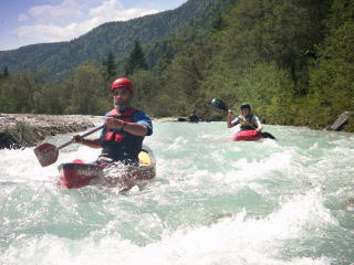 Wie oben schon erwähnt, reicht das Wasser oft nur so grad für eine Befahrung. Zumeist ist das Wasser nur 10-20 cm tief und hat nur eine verhältnismßig geringe Strömung. Es bleibt immer viel Zeit einen Blick auf die verhältnismäßig natürliche Flusslandschaft und auf die umliegende Berge zu werfen. Neben dem Blick auf die umliegende Berge sollte man aber auch immer mal wieder einen vorausschauenden Blick auf den weiteren Verlauf des Flusses halten, denn öfters verzweigt sich der Fluss zwischen den Kiesbänken, dass es durchaus mal passieren kann, dass man den falschen Arm erwischt. Außerdem kann manchmal auch der eine oder andere umgekippte oder angeschwemmte Baum die Weiterfahrt behindern (s. Bild unten). |