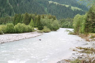 Eine weitere, insbesondere auch bei Canadierfahrern beliebte Strecke ist der Abschnitt unterhalb dem Campingplatz von Häselgehr. Zunächst geht es wie oberhalb von Häselgehr weiter. Im Gegensatz zu der oberen Strecke verläuft hier der Fluss dann aber auf der zweiten Hälfte der Strecke in einem breiten Kiesbett. Öfters teilt sich hier der Lech in mehrere Flussarme. Man könnte denken, das man irgendwo in Kanada und nicht mitten in Europa ist. Insgesamt ist dieser Abschnitt etwas leichter als der obere Abschnitt. Dieses resultiert insbesondere aus den größeren Abständen zwischen den etwas `schwereren´ Stellen und Passagen. Aber auch hier gibt es den einen oder anderen kräftigen Kies- oder Geröllbankschwall. Auch wenn im Prinzip die Schwierigkeiten hier gering sind, sollte der Fluss nicht unterschätzt werden. Insbesondere nach einem stärkeren Hochwasser oder nach evtl. Baumaßnahmen am Ufer kann aus einer harmlosen Stelle plötzlich auch eine etwas schwierigere oder sogar gefährliche Stelle werden. So taucht 1,5 Kilometer unterhalb des Campingplatzes von Häselgehr am rechten Ufer unvermittelt eine Prallwand auf, vor der mehrere senkrechte Eisenträger hervorragen und sich manchmal auch gerne angeschwemmte Bäume versammeln. Bei schneller Strömung daher möglichst großen Abstand von dieser Wand halten und ggf. lieber noch einmal eine Ehrenrunde im gegenüberliegenden Kehrwasser machen. Notfalls kann man aber auch die Stelle am linken Ufer umtragen. Der kräftigste Schwall und die zugleich schwerste Stelle (WW III-) auf dem unteren Abschnitt des Lechs befindet sich kurz unterhalb der Brücke von Stanzach, d.h. 9,6 Kilometer unterhalb des Campingplatzes von Häselgehr. Hier wartet auf der rechten Hälfte des Flusses, bedingt durch eine Felsrippe, eine mächtige Walze auf den ahnungslosen Paddler. Links gibt es aber eine leichte Durchfahrt. Bei Niedrigwasser sieht die Situation hier etwas anders aus. Dann wird hier das ganze Wasser auf nur 2-3 Meter am rechten Rand zusammengepresst und es entsteht hier ein wuchtiger aber fahrbarer Schwall mit hohen Wellen. |