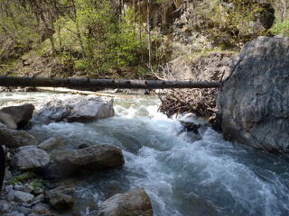 Im Frühjahr 2011 sah die Situation hier vorübergehend etwas anders aus: Der Abfall war total verholzt. Ein Großteil des Wassers floss nun rechts vor dem rechten großen Felsblock vorbei. Hiervor hing noch ein Baum, der aber knapp, bei nicht zu hohem Wasserstand, unterfahren werden kann (s. Bild unten). Danach geht´s in einer leichten Kurve links herum, in der sich zum Ende eine etwas rückläufigen Stufe befindet (s. übernächstes Bild). |
