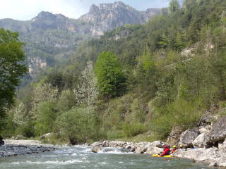 Notfalls kann in beiden Fällen die Passage über die Felsblöcke am rechten Ufer umtragen werden. Zwei Kilometern nach Fahrtbeginn sind die größten Schwierigkeiten vorbei. Ab hier folgen die Schwälle u.a. immer in Abständen und erreichen maximal WW III. Leider existiert hier oben keine weitere für Fahrzeuge gut erreichbare Einstiegstelle, so dass weniger erfahrene Paddler erst beim Dorf Macra ihre Paddeltour beginnen können. Zwei Kilometer unterhalb der Einstiegstelle befindet sich wohl das Dorf Bassura, das teilweise auch zwischen der Talstraße und dem Fluss liegt und auch einen Brücke am Fluss aufweist. Diese ist aber nur über einen sehr steilen Fahrweg anfahrbar, den wohl nur 4-Rad-Fahrzeuge bewältigen können. |