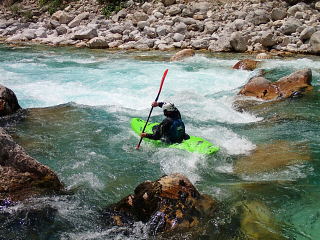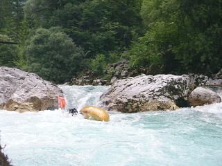 Nach diesem Katarakt wird die Soca wieder etwas offener. Einzelne Schwälle und mäßig-schwere Blockpassagen wechseln sich nun ab (WW II-III). Gelegentlich finden sich hier auch ein kleine Syphone, die aber alle bei ein wenig Aufmerksamkeit immer gut umfahren werden können. Später,
