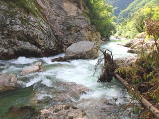 Ungefähr 2 Kilometer nach der `1. Socaklamm´ sollte dann beim Auftauchen einer langen Betonstützmauer am rechten Ufer einer großen Linkskurve des Flusses die Fahrt noch vor der Stützmauer am rechten Ufer beendet werden. Die Boote können dort über die Straße zu einem Lagerplatz getragen werden. Nach dieser Betonmauer wird der Ausstieg immer schwieriger. Alsbald beginnt dann auch die `2. Socaklamm´, deren Eingang unfahrbar ist. Da zur Fortsetzung der Fahrt auf der Oberen Soca die Klamm mindestens auf 800 m weit Umtragen werden muss, ist es zumeist sinnvoller dieses Stück mit dem Auto zu umsetzen oder den nachfolgenden Abschnitt erst an einem der nächsten Tage zu befahren. |