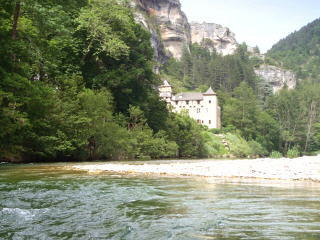 Der Tarn hat seinen Urspung in den bis zu 1674 m hohen Bergen der Cevennen. Auf dem Oberen Tarn bis Florac bietet der Fluss auf ca. 20 Kilometern schweres Wildwasser, hat hier aber nur im Frühjahr ausreichend Wasser. Anschließend verläuft der Tarn auf 10 Kilometern mit bis zu mittleren wildwassertechnischen Schwierigkeiten durch ein zunehmend enger werdendes Tal. Hier ist eine Befahrung oft bis Juni möglich. Ab Molines nimmt dann der Schluchtcharakter des Flusses zu. Ab hier sind die wildwassertechnischen Schwierigkeiten nur noch gering, so dass auch erfahrene Wanderpaddler diesen und die nachfolgenden Abschnitte gut befahren können. Ab La Malene, 30 Kilometer weiter, beginnt dann die `Gorges du Tarn´ (s. Bild unten), eine über 30 Kilometer lange herrliche Schlucht, die zumeist auch im Sommer befahren werden kann. |