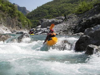 Am Ende hatten wir die 20 km in nur drei Stunden geschafft. Absoluter Höhepunkt unserer Reise war der Kir. Dessen kristallklares Wasser hat sich den Weg durch schneeweißes Grundgestein gebahnt und einen Kajakertraum mit Drop-Pool-Charakter in grandioser Landschaft geschaffen. Es erinnert alles ein bisschen an die Verzasca. Ähnlich wie dort ist auch die Verteilung der Schwierigkeiten. Es geht moderat mit WW 3-4 los und steigert sich dann bis WW5. |